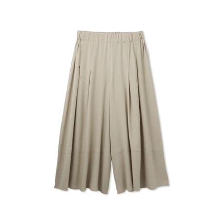 ウエストはぐるりゴム仕様のリラクシーな履き心地ですが、ワイドなウエスト幅と高めに切り替えたヘムデザインが構築的な印象を感じさせるデザインです。