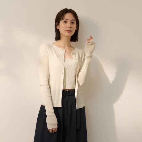 ドライでサラッとしたテクスチャーのリネンタッチクルーネックニットカーディガンと同素材のニットキャミソールの2ピースアイテムです。