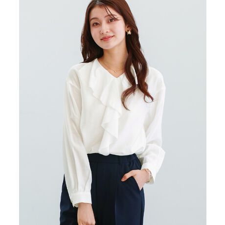 ブラウス フリルブラウス ラッフルフリル シルキーローン オフィスコーデ きれいめ 上品 フェミニン 長袖ブラウス 通勤服