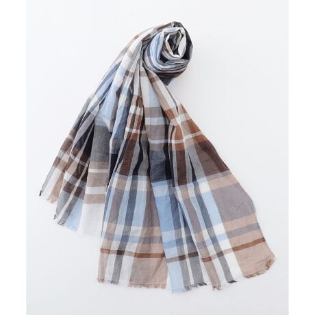 首元に巻くだけで存在感を放つ、大きなチェック柄のデザインです。清涼感のあるカラーリングで、春夏のスタイルを格上げするサマーストールとして仕上がっています。