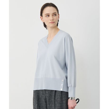 ■デザインゆったりとしたドルマンスリーブが着心地良く、首元を綺麗に見せるシャープな印象のVネックで、こなれ感を演出するニットトップスです。着丈は、ワイドパンツやフレアスカートとも相性の良い長すぎない設定にこだわりました。左裾にあしらわれたメタル釦がアクセントになり、ボタンの開閉によってスリットを調整できるため、合わせるボトムスに応じたスタイリングが楽しめます。オフィスシーンから休日スタイルまで、デイリーに活躍する万能な一枚です。