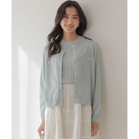 ■デザイン・小さな襟と長すぎないコンパクト丈がシックでモダンなカーディガン。・首や肩が美しく見える絶妙なバランスと、少し多めの釦、だましポケットがシンプルなデザインのチャームポイントになっています。・適度なハリがあるのでダルっとせず好バランスがつくれ、コーディネート次第で様々な表情をみせてくれます。釦を全部留めてプルオーバーのように着るのもおすすめです。・インナーは、美しいシルエットラインで仕上げたシックなクルーネック。少し詰まったネックと程よいフィット感が心地よい1枚です。・膨張してみえないバランスのリブピッチ、腕が綺麗にみえる袖丈、ややゆとりのあるサイズ感にこだわっています。・シンプルで合わせるものを選ばないので、カジュアルからキレイめまで幅広いコーディネートで大活躍間違いなしのアイテムです。