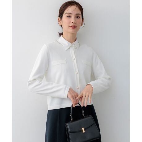 小さな襟元に施した華やかなパーツとコンパクトな着丈がモダンなカーディガン