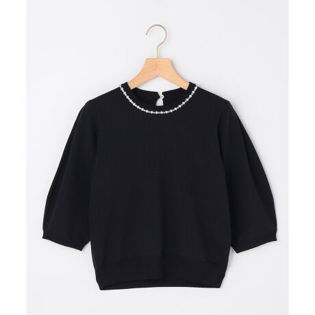 華やかなパーツを施した襟元が女性らしいシンプルベーシックな6分袖ニット