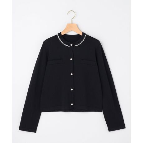 【スタッフコメント】▼身長158cm|着用サイズM (通常着用サイズM)首元のビジューが上品な主役級カーディガンです。クリアな素材感なので品のあるきれいめスタイリングがこれ1枚で叶います。
