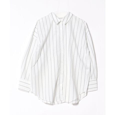 様々なシーズンに活躍するコットン混のストライプ柄素材を使用。トレンドレスな柄で、長く着ていただける1枚に仕上がっています。一見ベーシックなデザインですが、顔回りをすっきり演出してくれるコンパクトな襟と、袖口のボリューム袖のバランスが絶妙です。さらに大人の女性が着まわせる大き過ぎないオーバーサイズも人気のポイントです。
