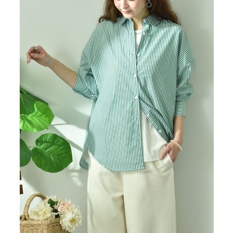 様々なシーズンに活躍するコットン混のストライプ柄素材を使用。トレンドレスな柄で、長く着ていただける1枚に仕上がっています。一見ベーシックなデザインですが、顔回りをすっきり演出してくれるコンパクトな襟と、袖口のボリューム袖のバランスが絶妙です。さらに大人の女性が着まわせる大き過ぎないオーバーサイズも人気のポイントです。