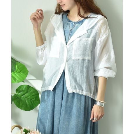 着るだけで旬なスタイルがシアーブルゾン。これからのシーズンには嬉しいUV加工のメリット付き。またナチュラルなシワ感と上品なシアー感があり、柔らかい素材を使用しているのでごわつかず女性らしく着ていただけます。