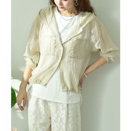 着るだけで旬なスタイルがシアーブルゾン。これからのシーズンには嬉しいUV加工のメリット付き。またナチュラルなシワ感と上品なシアー感があり、柔らかい素材を使用しているのでごわつかず女性らしく着ていただけます。