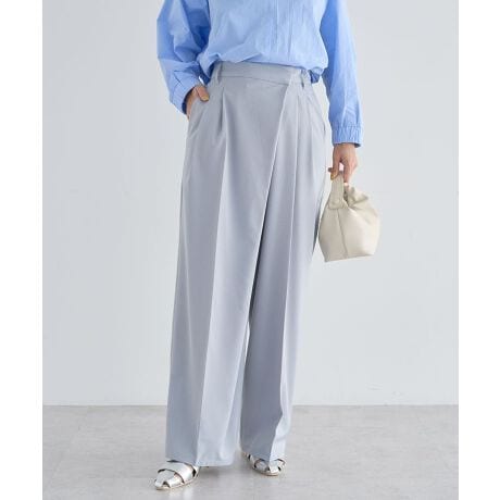 アシメデザインで差がつく上品タックパンツウエストのアシンメトリーデザインが目を引く、洗練された印象のタックパンツです。フロントに入ったタックが縦ラインを強調し、脚をすっきりと長く見せてくれます。シンプルでありながらさりげない個性が光り、いつものコーディネートを格上げしてくれる一本です。後ろウエストはゴム仕様で、きちんと感を保ちながらも快適なはき心地を叶えます。ブラウスやニットを合わせれば通勤スタイルに、カットソーと合わせれば上品カジュアルな装いにもなじみます。季節を問わず着回しやすく、定番としてワードローブに揃えておきたいアイテムです。透け感[なし]
