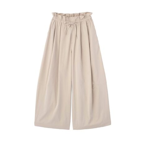 ウエストフリルで叶える大人の抜け感ワイドウエストにあしらったフリルデザインが、さりげない華やかさを添えるワイドコクーンパンツです。ギャザー仕様でやさしくフィットし、リラックス感のあるはき心地を叶えます。丸みのあるコクーンシルエットとワイドラインが体のラインを拾いにくく、自然に体型カバーができるのも魅力です。トップスをインすればウエストデザインが引き立ち、シンプルな装いもぐっとおしゃれに仕上がります。ナチュラルな風合いでデイリーコーデに取り入れやすく、きれいめブラウスからカットソーまで幅広く好相性です。季節を問わず活躍し、毎日の着こなしをやさしく格上げしてくれる一本です。透け感[なし]