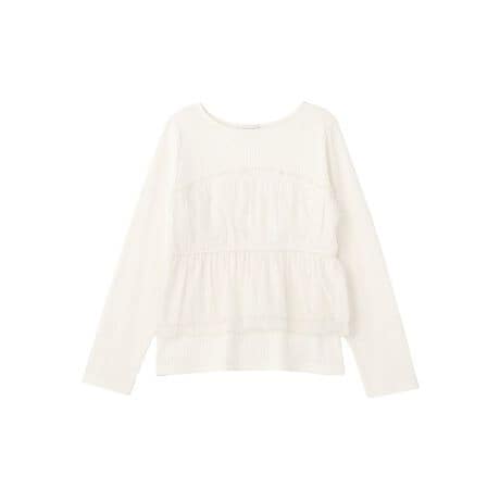 異素材ミックスで叶える上品カジュアル透け感のあるオーガンジービスチェをドッキングした、華やかな存在感のあるプルオーバーです。やわらかなリブ素材と軽やかな異素材の組み合わせが、シンプルながらも印象的な着こなしを演出します。一枚でレイヤード風スタイルが完成するため、忙しい朝でもコーディネートに迷いません。程よくゆとりのあるシルエットでリラックス感があり、体のラインをさりげなくカバーしてくれるのも魅力です。デニムやワイドパンツと合わせた大人カジュアルコーデはもちろん、きれいめボトムと合わせればお出かけスタイルにも活躍します。季節の変わり目にも取り入れやすく、着回し力の高いトップスとしてワードローブにおすすめです。透け感[ややあり]