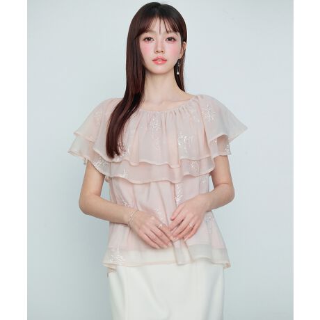 ふんわり軽いオーガンジー素材のシアーブラウスです。オーガンジーには小花柄の刺繍入りでディテールまで可愛らしく決まります。