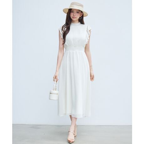 ノースリーブですが、身頃の肩からウエストにかけて仕立てられたフリルのあしらいが袖のようになり、気になる腕のラインをぼかしてくれます。