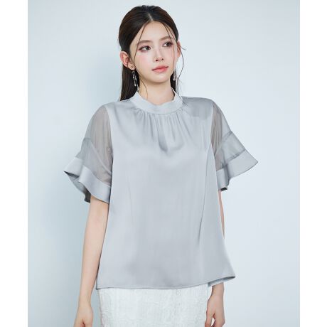光沢サテンとシアー袖のバランス感がエレガントな半袖春ブラウス。