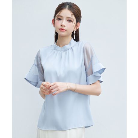 光沢サテンとシアー袖のバランス感がエレガントな半袖春ブラウス。