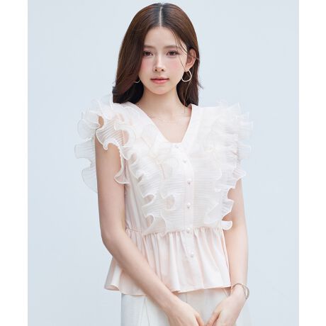 プリーツのラッフルフリルがあしらわれた可愛いノースリーブブラウス。