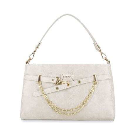 かっちりとした印象のスクエアディテールのショルダーバッグ。前面には取り外し可能なチェーンチャームが付属。