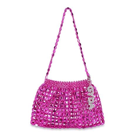 ビーズのようなメタリックパーツを使用したアクセサリー感覚で持てるミニバッグ。きらきらと輝くバッグにはラインストーンロゴチャームを付け、よりきらきら感を高めました。