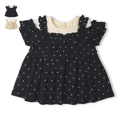 重ね着風のドッキングデザインの半袖Tシャツ。ブラックは水玉柄のさらっとした天竺素材にリブのインナーを重ねたドッキングチュニックTシャツデザイン。肩のフリルもポイント!ベージュは袖口と切替下に布帛を使用したドッキングデザインの半袖Tシャツ。ふんわりと広がる綺麗なシルエットがポイント!【アイテム】半袖 プレゼント ギフト プルオーバー 赤ちゃん服 ベビー服 贈り物 トップス 無地 シンプル ガーリー カジュアル お洒落 オシャレ かわいい 可愛い 普段着 デイリーウェア お出かけ着 子ども こども 女児 女の子 ガールズ キッズ ベビーサイズ 幼稚園 保育園通園 2026年春夏物新作 丸高衣料 ドット 黒色 キッズズー