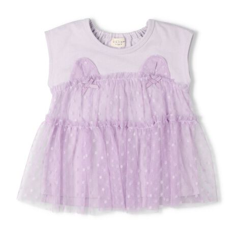 ふんわりチュールを重ねたチュニックTシャツ。ラベンダーにはねこ、ピンクにはうさぎの耳のデザインが可愛い!リボンもポイント!衿ぐりの後ろがゴム仕様なので、着脱もスムーズに出来ます。【アイテム】半袖 プレゼント ギフト プルオーバー 赤ちゃん服 ベビー服 贈り物 トップス 無地 シンプル ガーリー カジュアル お洒落 オシャレ かわいい 可愛い 普段着 デイリーウェア お出かけ着 子ども こども 女児 女の子 ガールズ キッズ ベビーサイズ 幼稚園 保育園通園 2026年春夏物新作 丸高衣料 薄紫色 ネコ 猫 ウサギ アニマル 動物 キッズズー コットン100% 綿100%