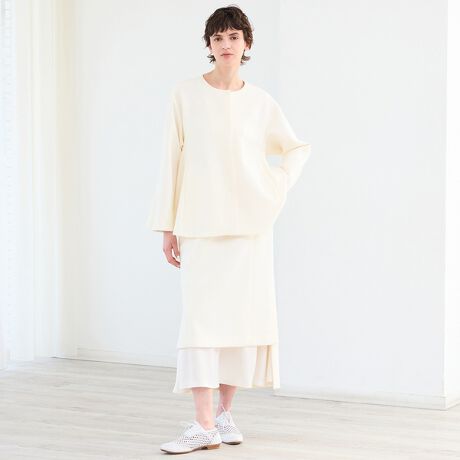 特有の張り感とスポンディッシュな反発感が特徴なダンボールジャージに、しなやかで艶のあるトリアセテートをミックスすることで、表面の艶としっとりとした落ち感を持たせた、美しいルックスを演出するスカートです。