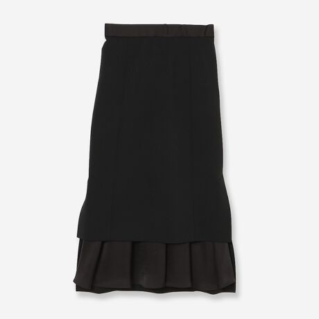 特有の張り感とスポンディッシュな反発感が特徴なダンボールジャージに、しなやかで艶のあるトリアセテートをミックスすることで、表面の艶としっとりとした落ち感を持たせた、美しいルックスを演出するスカートです。