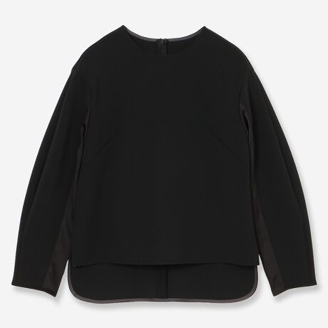 特有の張り感とスポンディッシュな反発感が特徴なダンボールジャージに、しなやかで艶のあるトリアセテートをミックスすることで、表面の艶としっとりとした落ち感を持たせた、美しいルックスを演出するブラウスです。