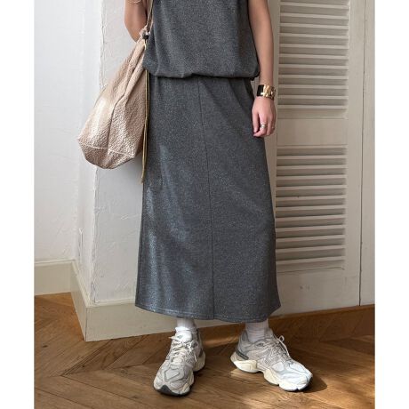 細かく繊細にラメを織り込んだ裏毛素材を使用した、さりげない表情のIラインスカート。
