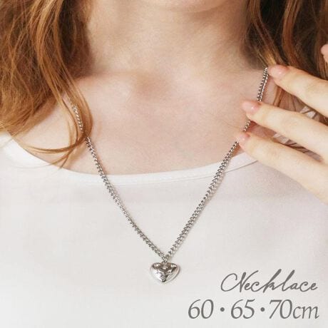 可憐なハートモチーフにきらめくラインストーンをあしらった、華やかなネックレス。首元で揺れる小ぶりなペンダントトップが、女性らしい雰囲気を引き立てる。シンプルなデザインなのでトップスの襟もとの形に左右されない使いやすさが抜群。お手持ちのネックレスとの重ね付けもおすすめ。※モデル着用サイズ:シルバー60cm