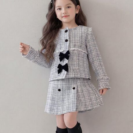 女の子が大好きな可愛らしいツイード素材のセットアップが登場♪上品なリボンがアクセントになり、シンプルでありながら華やかさを引き立てます。ホワイトをベースとして、柔らかなサックスとブラックのチェックが大人っぽく、卒園式や入学式などの特別なシーンにぴったり。温かみのあるツイード生地が、寒い季節でも快適に過ごせます。上品なディテールと着心地を兼ね備えたこのセットアップで、特別な日をもっと素敵に♪