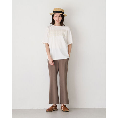 布帛見えするジャージ素材のセミフレアーパンツ。
