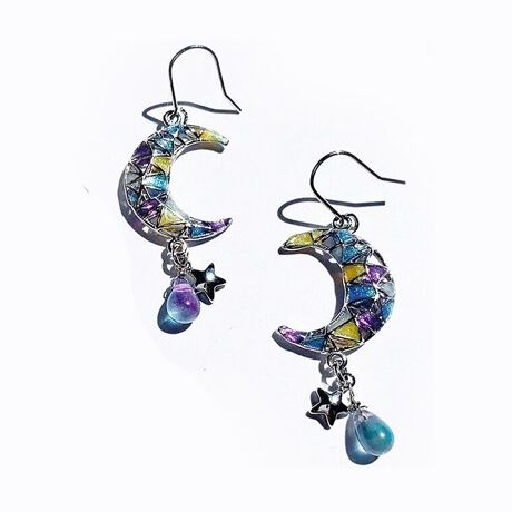 神秘的な色合わせの月にグラデーションの綺麗なガラスを合わせたピアスです。