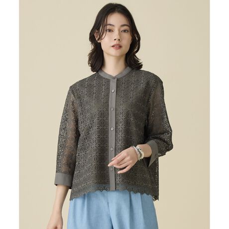 ボトムを選ばず着こなせる、幾何学レースのクロップドブラウス■デザイントレンド感がありながらも短すぎない、程よいバランスのクロップド丈ブラウスです。ワイドパンツやフレアスカートなど、ボリュームのあるボトムとの相性も抜群です。レースと同色の無地生地でブロッキングすることで、程よく素材のコントラストを効かせたデザインに仕上げています。エレガントすぎない柄のレースは、シンプルなボトムに合わせるだけで華やかなコーディネートをお楽しみいただけます。■素材お花をイメージした幾何柄のレース生地です。刺繍の技法を用いて、繊細でほどよい膨らみを持たせた、高級感のある透かし模様に仕上げています。絹のような風合いのポリエステル糸を使用しているため、さらりと快適な着心地です。