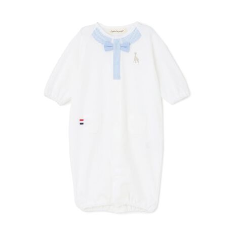 肌触りの良いコットン100%の生地を使用したカバーオールです。見せかけの衿と前立てに挟み込まれた蝶タイで、きちんと感のあるデザインに仕上げました。新生児期はドレス型、生後2、3ヵ月からパンツ型に着方を変えられる2WAY仕様。股部分のボタンの留め方次第で、6ヵ月弱まで着用できるのもうれしいポイントです。【おすすめの着用時期は春夏シーズン】