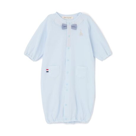 肌触りの良いコットン100%の生地を使用したカバーオールです。見せかけの衿と前立てに挟み込まれた蝶タイで、きちんと感のあるデザインに仕上げました。新生児期はドレス型、生後2、3ヵ月からパンツ型に着方を変えられる2WAY仕様。股部分のボタンの留め方次第で、6ヵ月弱まで着用できるのもうれしいポイントです。【おすすめの着用時期は春夏シーズン】