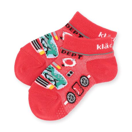 さまざまな乗り物をモチーフにした4種のスニーカーインソックスです。赤は消防車、黄色とエメラルドグリーンは電車、黒はパトカーのデザイン。乗組員のティラノサウルスが可愛いポイントになっています。メッシュ編みで通気性が良く、長時間でも快適なはき心地です。足底にはすべり止めプリントを備えました。内側にお名前を記入できるスペースつき。