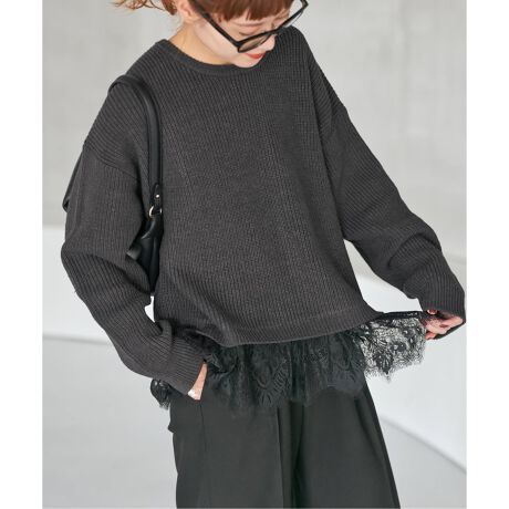 しっかりとした肉感のニットと、裾の透け感あるレースのコントラストが、レイヤードスタイルにさりげない華やかさをプラスします。