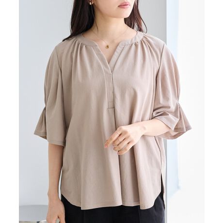 袖にはタックを施し、ふんわりとした立体感のあるシルエットに。気になる二の腕を自然にカバーしながら、女性らしい印象に仕上げました。身幅はゆとりのあるシルエットで、リラックス感のある着心地も魅力です。