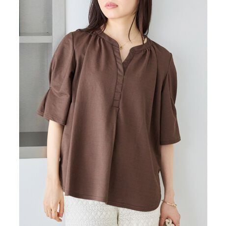 袖にはタックを施し、ふんわりとした立体感のあるシルエットに。気になる二の腕を自然にカバーしながら、女性らしい印象に仕上げました。身幅はゆとりのあるシルエットで、リラックス感のある着心地も魅力です。