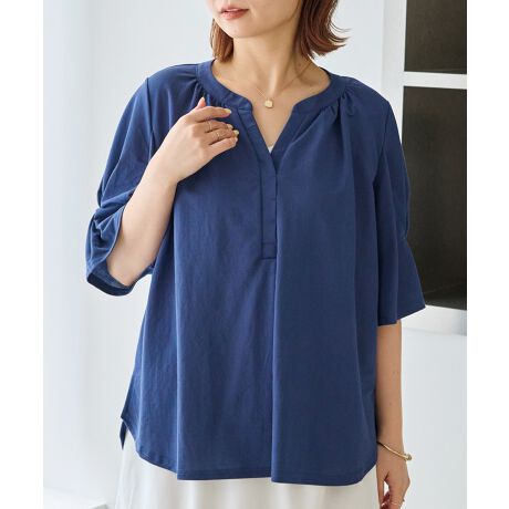 袖にはタックを施し、ふんわりとした立体感のあるシルエットに。気になる二の腕を自然にカバーしながら、女性らしい印象に仕上げました。身幅はゆとりのあるシルエットで、リラックス感のある着心地も魅力です。