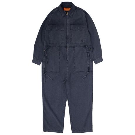 ワークウェアをベースに仕立てた、ジップ仕様のジャンプスーツ。