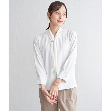 ボウタイの取り外しができ、さらにメタルバーを外した着こなしも楽しめる3WAY仕様のブラウス。
