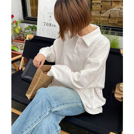カジュアルなスウェットに襟をつけて程よくきれいめな印象に