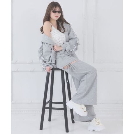 裾まわりにビジューを施したスウェットパンツが再登場。