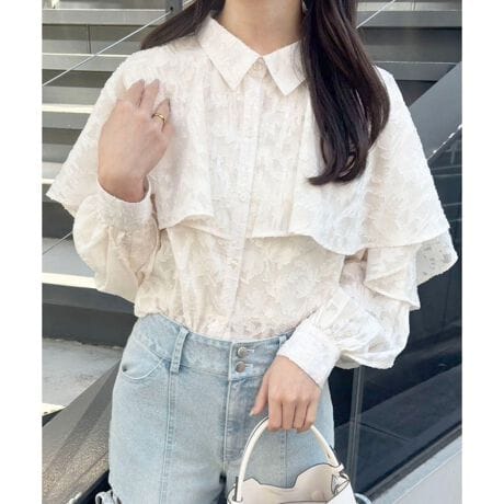 上品な印象のケープ風のデザインが目を引くブラウス。