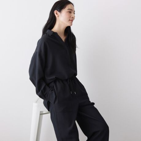 落ち感のあるスキッパーデザインのトップスと、すっきりとしたワイドパンツを組み合わせたセットアップ。