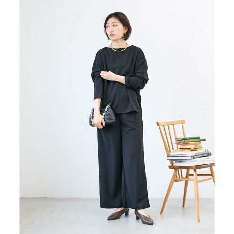 トップスはシンプルなクルーネックにセンターの切替でアクセント