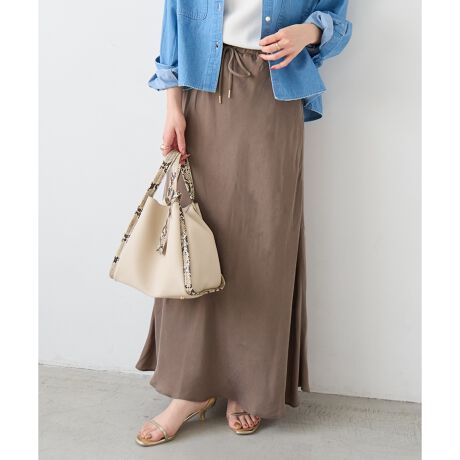 微光沢のとろみ素材が魅力で裾へ向かうドレープ感も美しい、シルエットにこだわったナロースカートです。