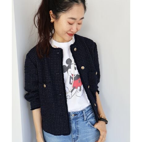 さりげなく織り込まれたリボンヤーンとラメ糸使いが上品な軽く羽織れるツイードジャケット。